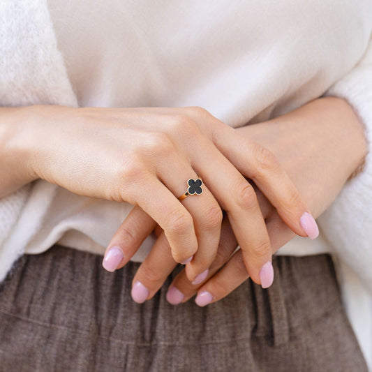 Ring mit Kleeblatt aus schwarzem Harz, 925er Silber mit Vergoldung