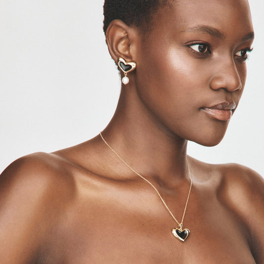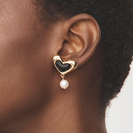 Boucles d'oreilles coeur en résine noire et perle, argent 925 plaqué or jaune NOUVEAU ROMANTIQUE